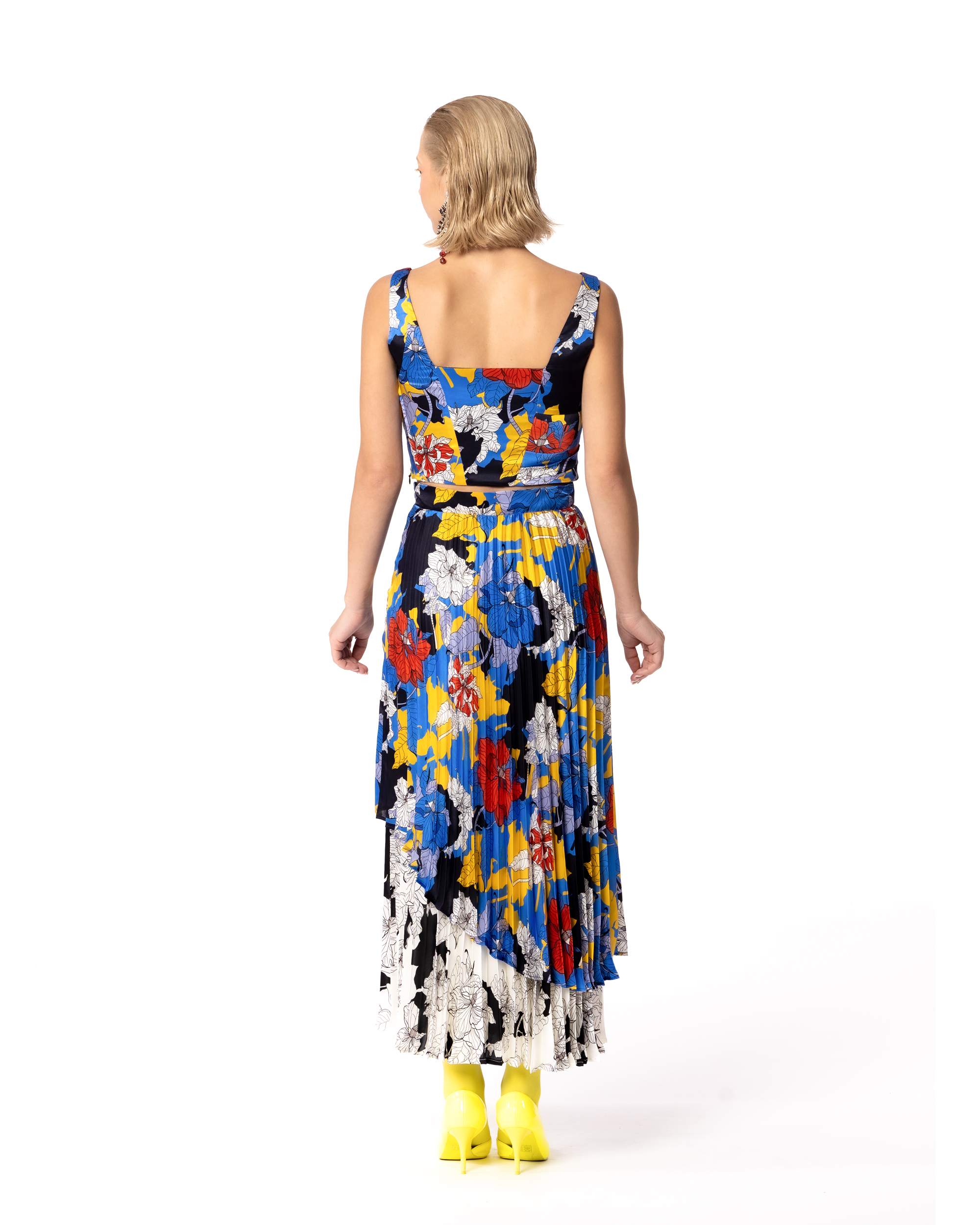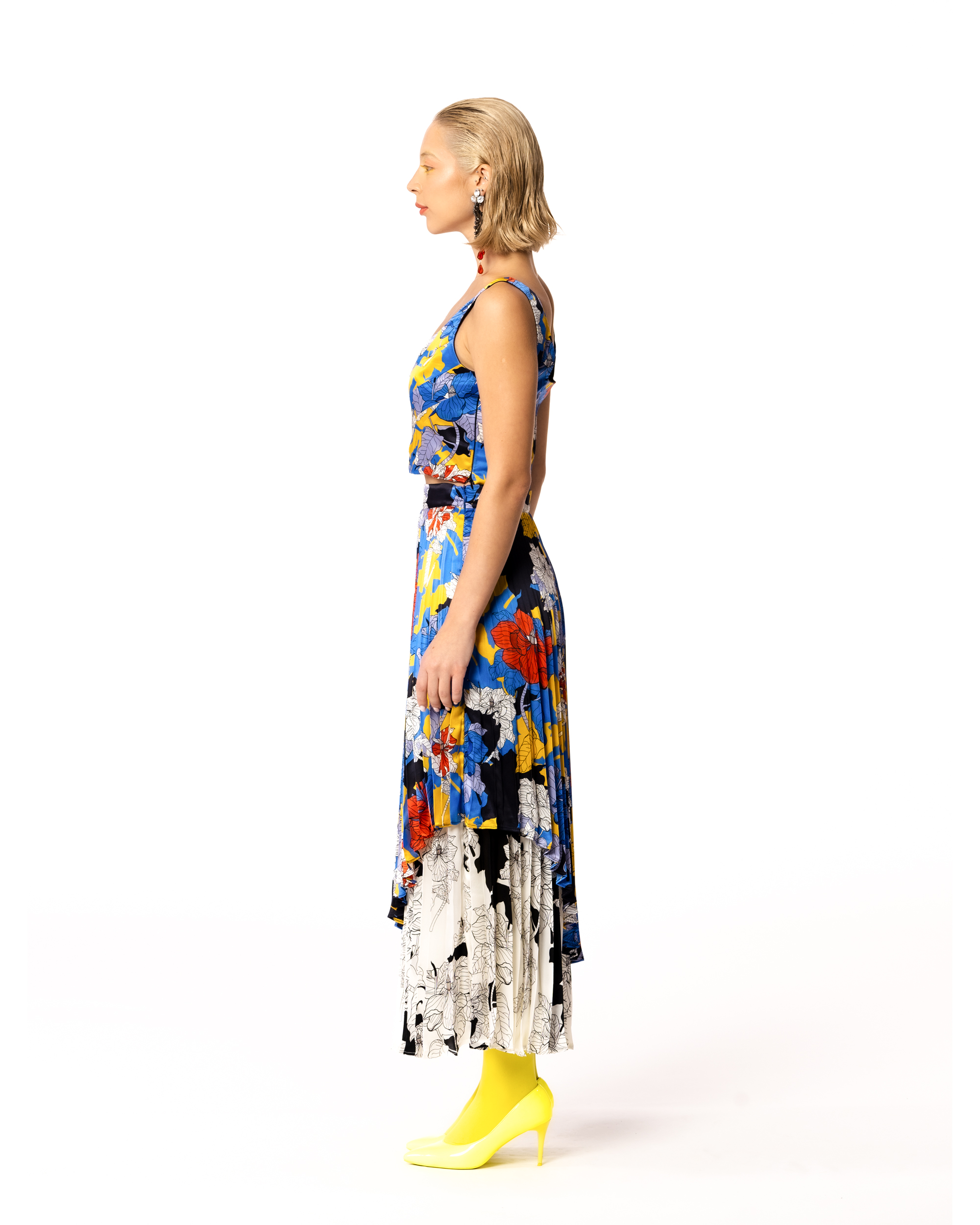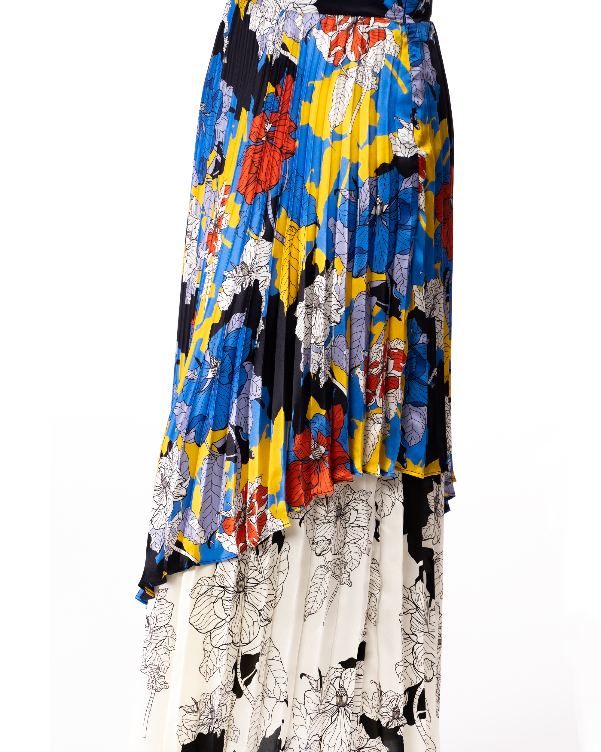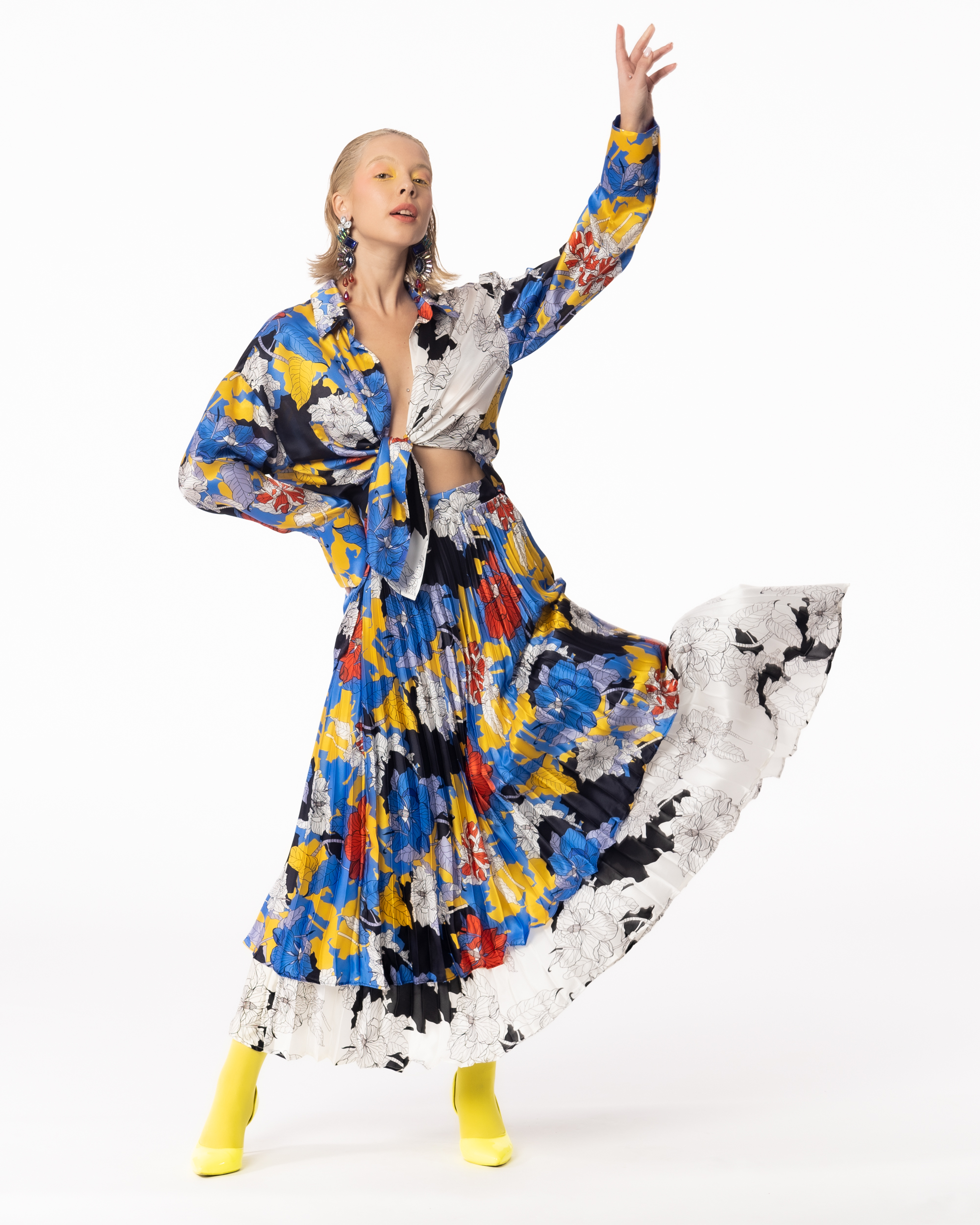 Long skirt with two asymmetric layers of pleats in contrasting floral print. The design creates uniqueness and catches the eye through its beautiful bright print colour, and gentle pleats that create ephemeral flare with movement. The pure Silk of the skirt makes it feel very light and luxurious.