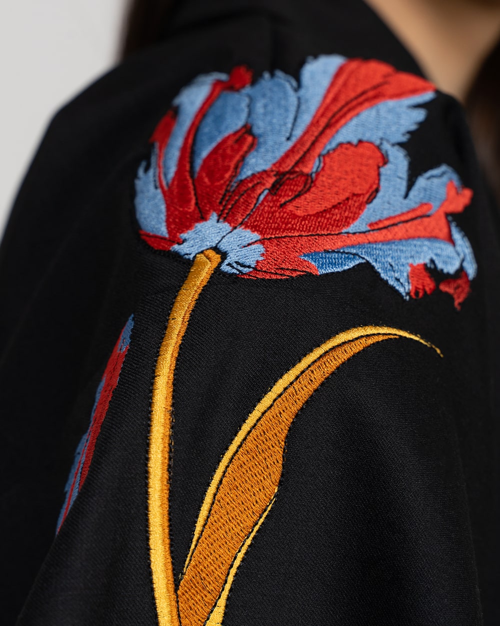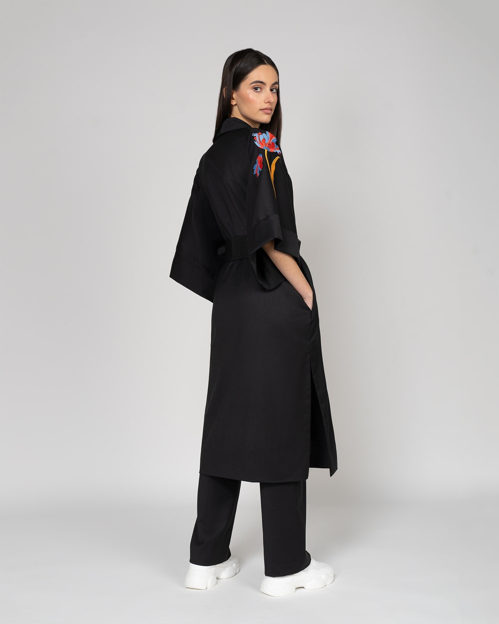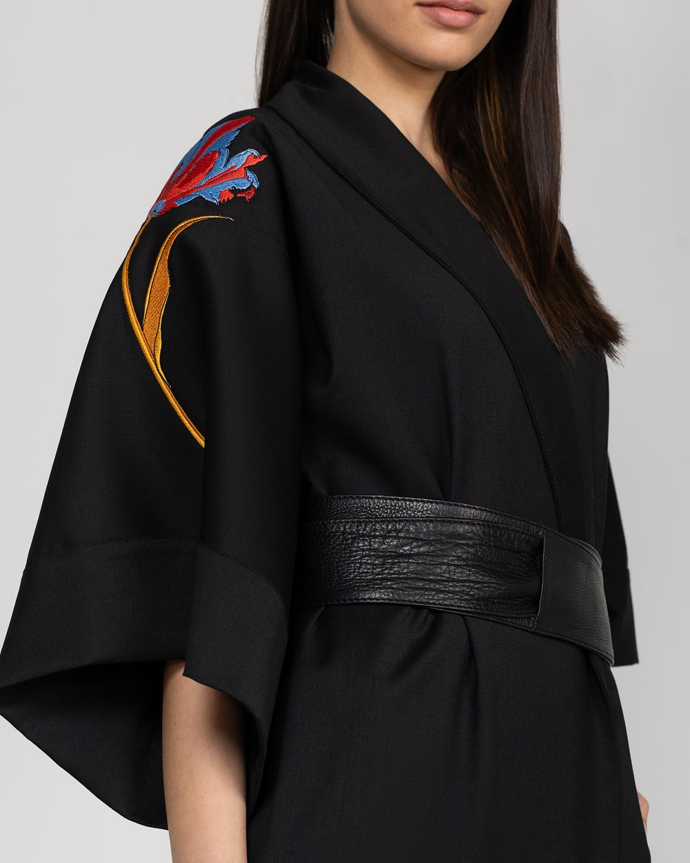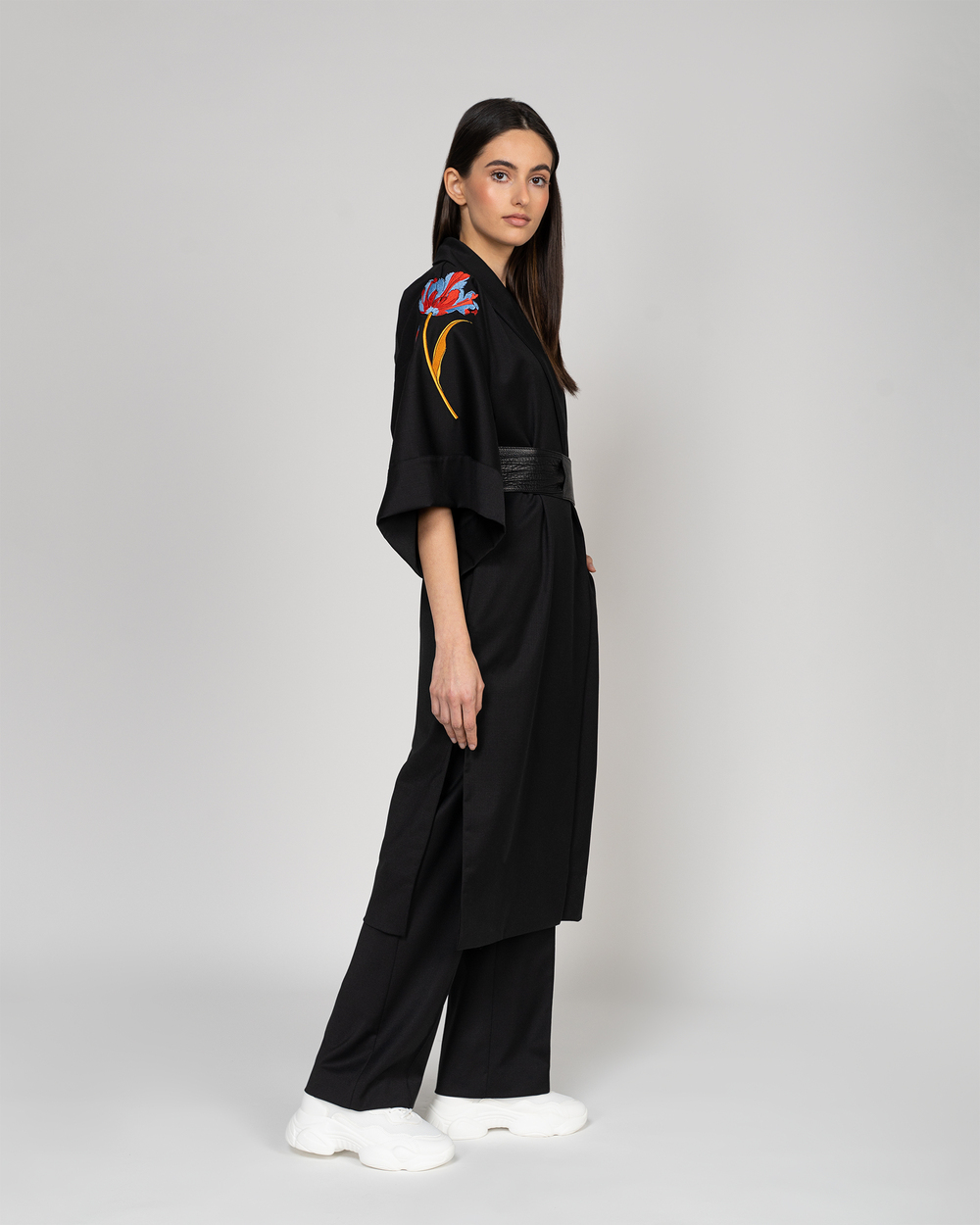Kimono style coat with parrot tulip embroidery in a blend of Virgin Wool and Polyester.